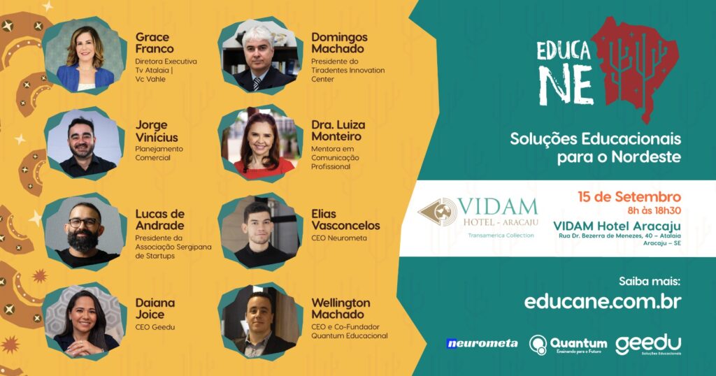 Idealizado pela Geedu, Quantum e Neurometa, startups reconhecidas no setor educacional, o Educa NE proporcionará um ambiente dinâmico repleto de palestras, painéis e oportunidades de networking exclusivas, reunindo os principais atores do setor educacional das escolas privadas dos nove estados do Nordeste: Alagoas, Bahia, Ceará, Maranhão, Paraíba, Pernambuco, Piauí, Rio Grande do Norte e Sergipe. Para fazer sua inscrição e participar do Educa NE, é só clicar no link https://educane.com.br/#ingresso . Lá, também é possível conferir toda a programação com palestrantes e outros detalhes do evento.